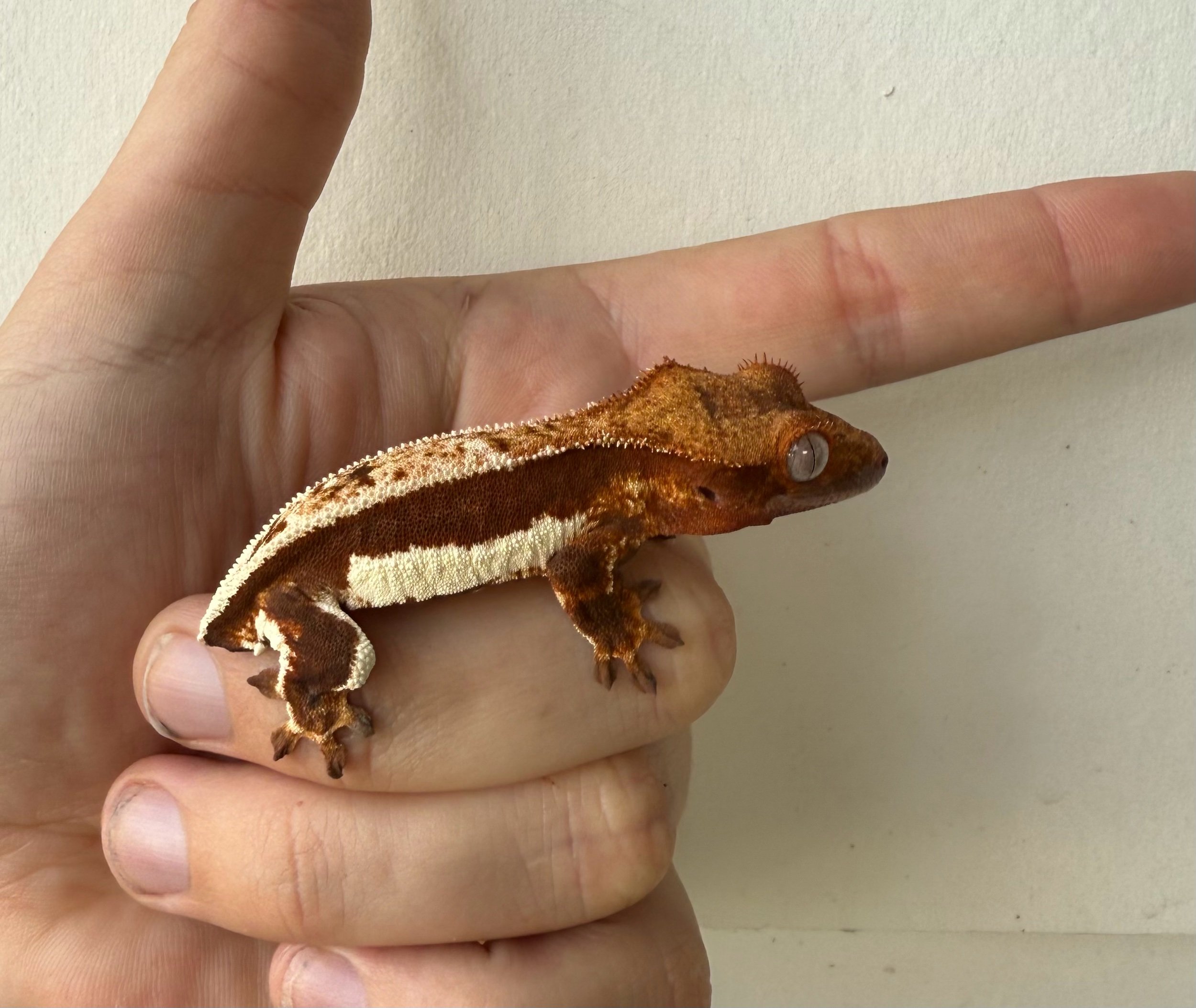 This is a nice lilly white from Rogue x Cherry. I am not sure if the base color will brighten to a nicer red or stay dark, it is hard to say. I expect it to be more of a brick red. This gecko is 7 grams and hatched 2/26/25. feeding on Pangea crested gecko diets and crickets once a week.
